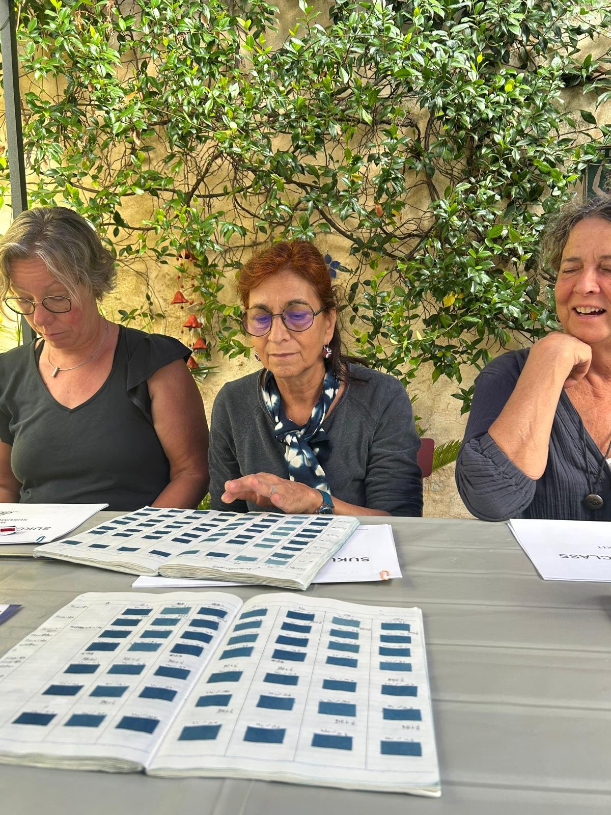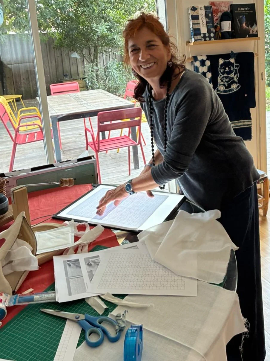 Ma cercavo di più, qualcosa che avesse a che fare ancor meglio con la spiritualità e con le origini di questa tecnica nella cultura giapponese. Altre ricerche in rete e, finalmente, ho conosciuto Makiko Tokunaga, esperta maestra di Shibori e Sukumo che vive a Tokushima. ( indigoblue4u ). Con lei mi sono addentrata e fatta trasportare nella particolarità della tintura naturale del Sukumo, nel fascino della precisione dei suoi shibori, riconoscendo e apprezzando il Kami e l'amore che lei esprime per questa pratica. Ho voluto strenuamente che diventasse la mia maestra e ho avuto l’occasione di invitarla a Genova per il mio primo vero seminario di shibori e indaco giapponese. Poi, sempre più entusiasta dei risultati ottenuti, nell’estate 2024 l’ho seguita per un seminario residenziale nelle Blue Mountains negli Stati Uniti, organizzato da Aya Fiber Studio di Suzanne Connors ( ayafiberstudio ) un’altra esperta ed eclettica insegnante che svolge la sua attività formativa in Florida. Durante il lungo seminario ho imparato a creare una vasca di Sukumo, l’originale tintura giapponese che dona un blu caldo e profondo, solo con ingredienti naturali, e affinato e imparato nuove tecniche Shibori.