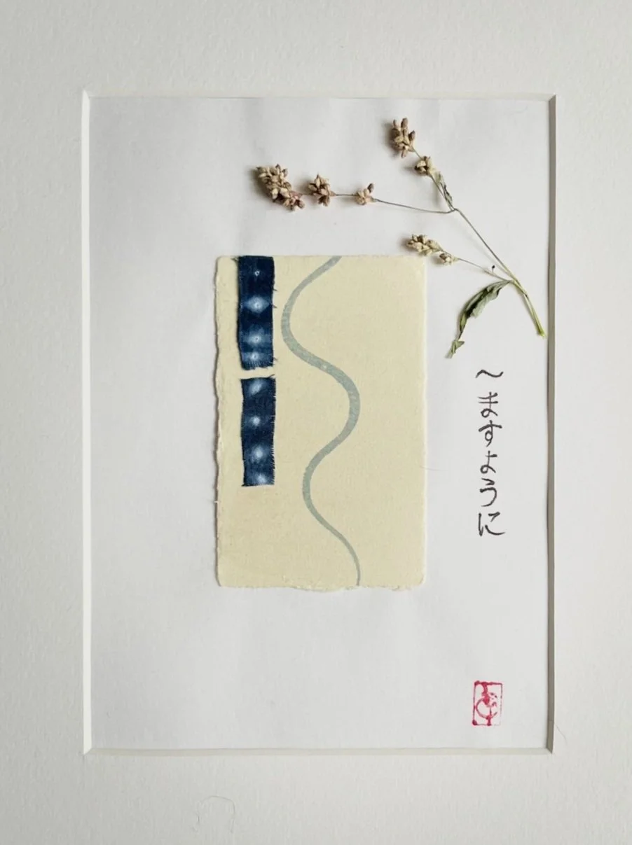 Cartoncino di carta di gelso Kozo Awagami fatto a mano, dipinto con indaco giapponese con inserti di tessuto di cotone shibori tinto con indaco giapponese, rametto con foglia e semi di indaco giapponese essiccati , su supporto di carta washi decorata con calligrafia a mano. 23×32 cm