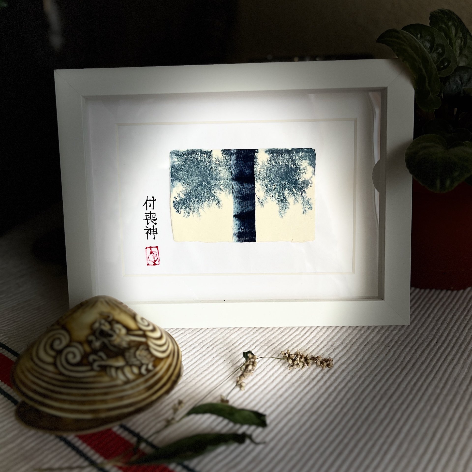 Cartoncino di carta di gelso Kozo Awagami, fatto a mano, dipinto con indaco giapponese con inserti di tessuto di cotone shibori tinto con indaco giapponese, su supporto di carta washi decorata con calligrafia a mano. 20×15 cm